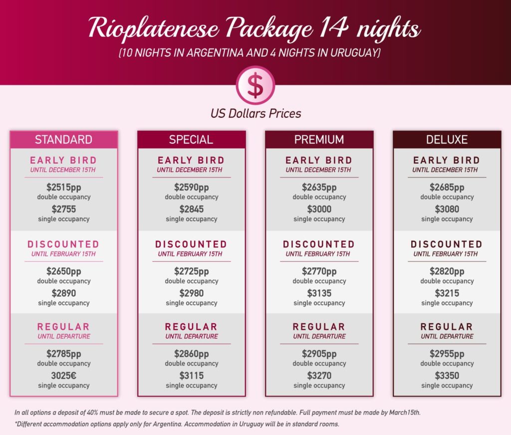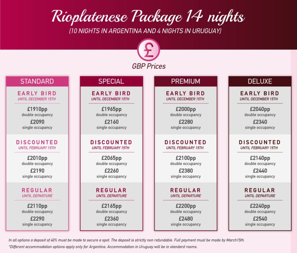 Please check the packages to choose the right accommodation and price for you. Note that different accommodation options apply only for Argentina. Accommodation in Uruguay will be in standard rooms.